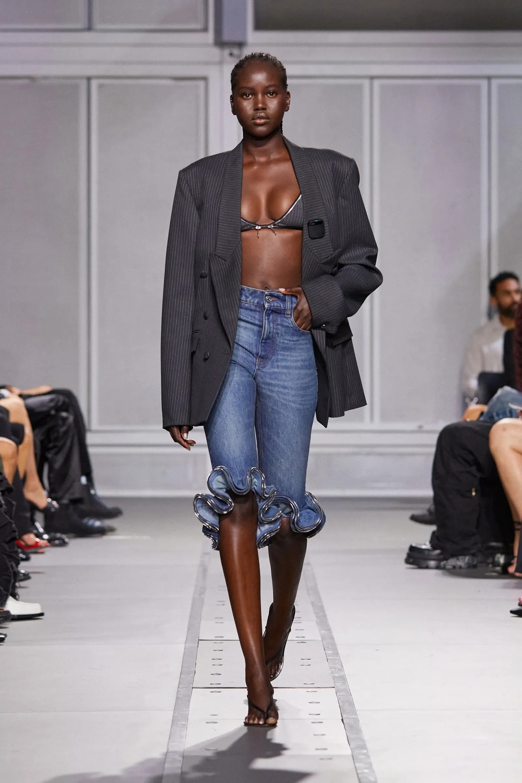 Đây có lẽ là xu hướng quần jeans ít ai ngờ đến – quần jeans được thiết kế nhiều dây buộc. Quần jeans phối dây buộc xuất hiện lần đầu tiên trên đường băng Xuân – Hè 2024 của Stella McCartney. Thương hiệu thời trang vùng Scandinavian – Rotate – cũng giới thiệu mẫu quần jeans dây buộc trong bộ sưu tập mới nhất (Ảnh: Stella McCartney).